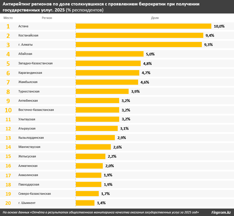 Наиболее высокая доля респондентов, столкнувшихся с бюрократией, зафиксирована в Астане - 10%. Далее следуют Костанайская область (9,4%) и Алматы (9,3%). Эксперты связывают такие показатели с перегруженностью государственных органов, избыточным документооборотом, очередями и сложностями при получении услуг в электронном формате. В случае столицы дополнительным фактором может выступать сосредоточение центральных госорганов.