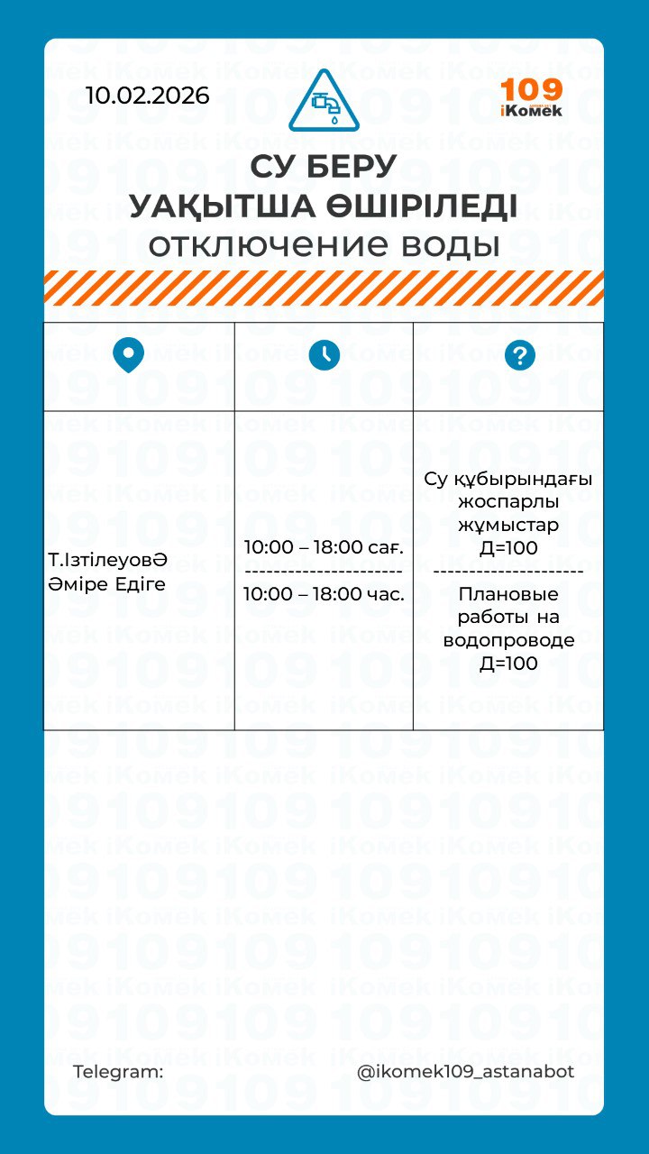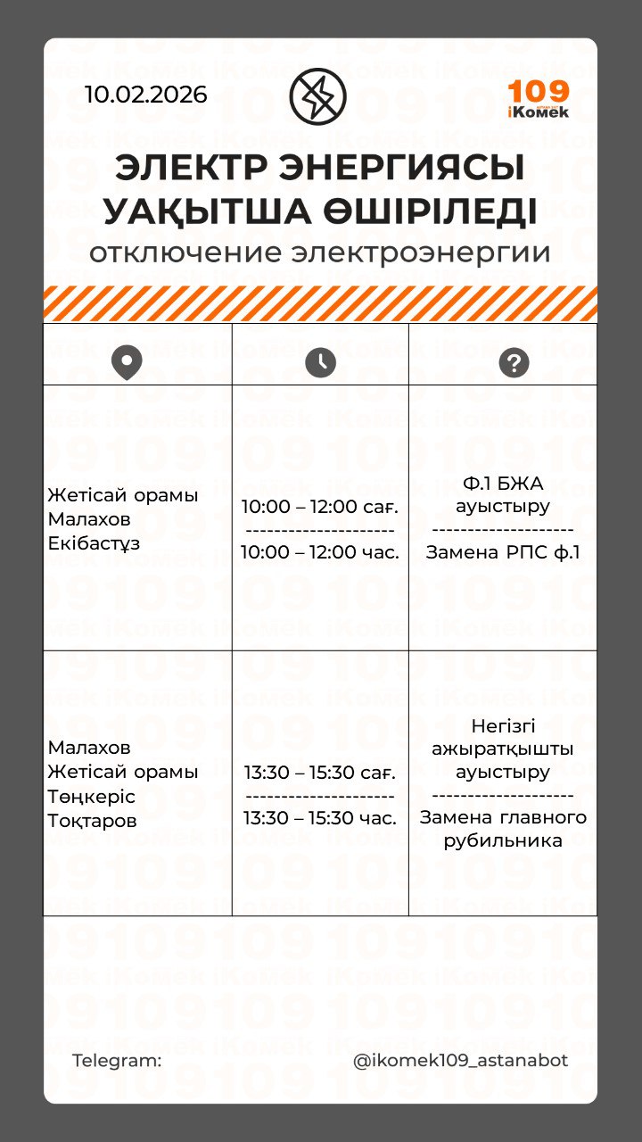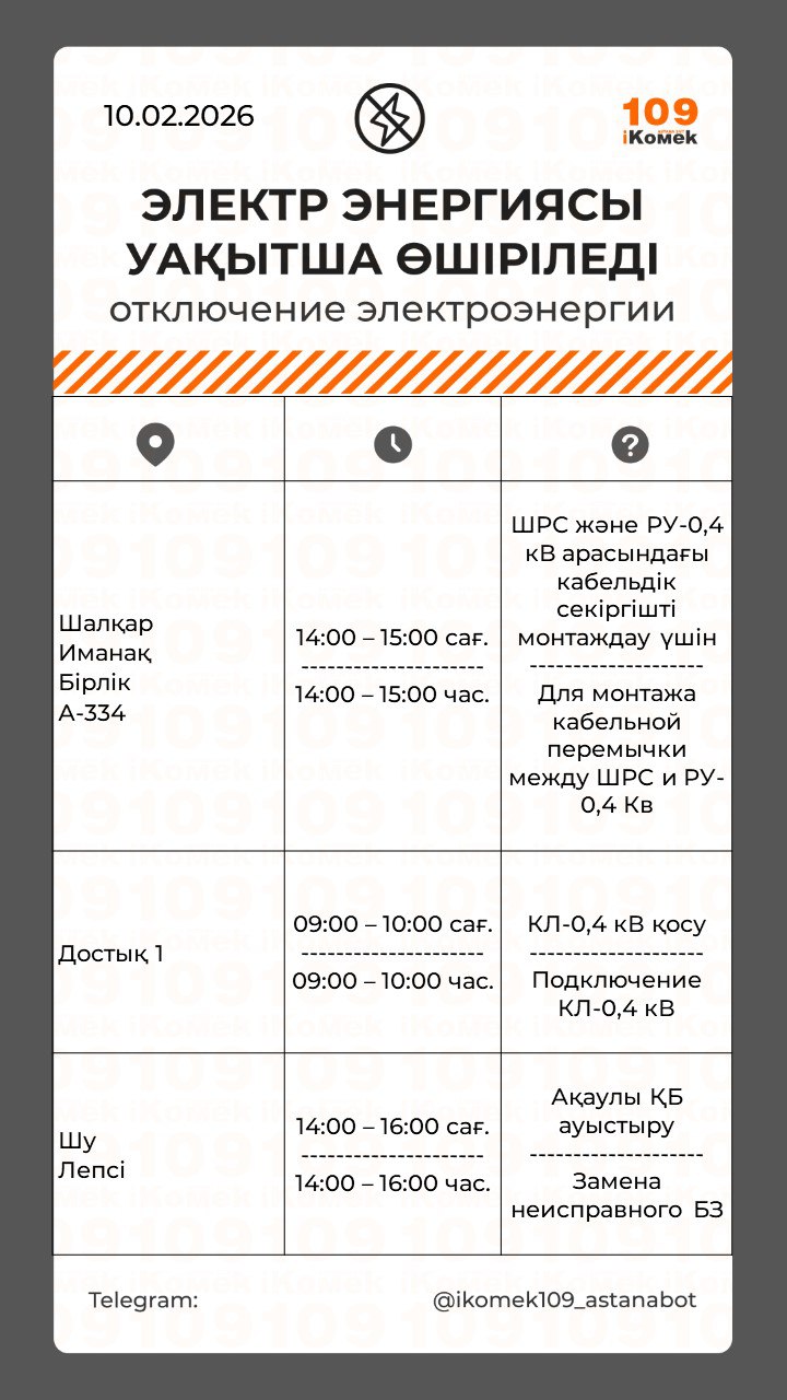 10 февраля без электричества и воды останутся только некоторые районы столицы, передает inbusiness.kz.