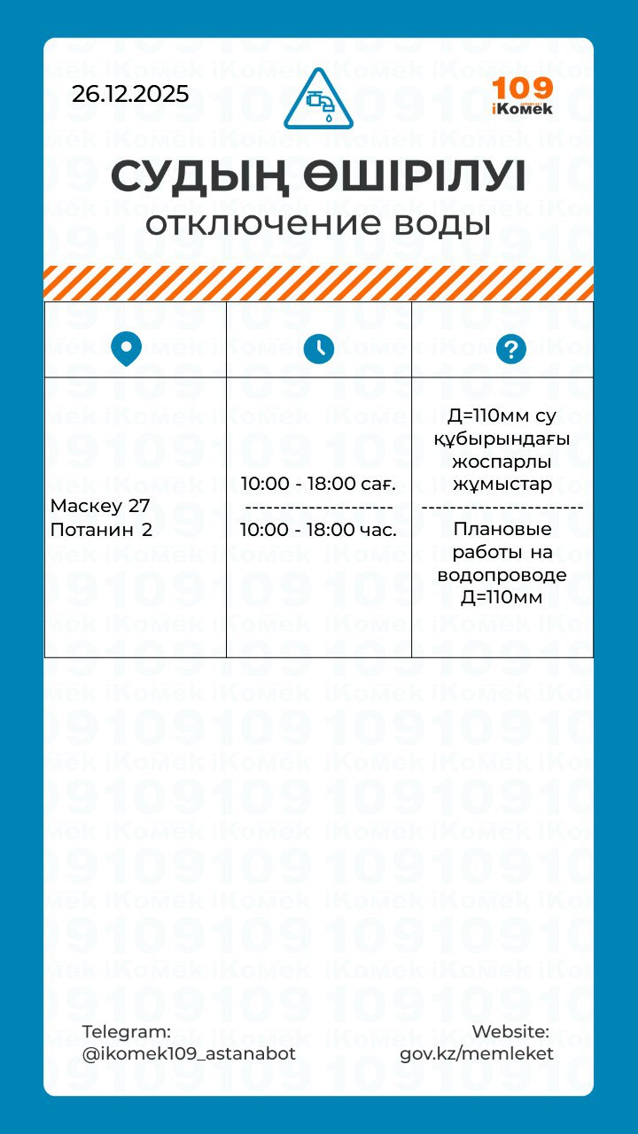 С 10:00 до 18:00 воды не будет на Маскеу, 27 и Потанина, 2, передает inbusiness.kz.