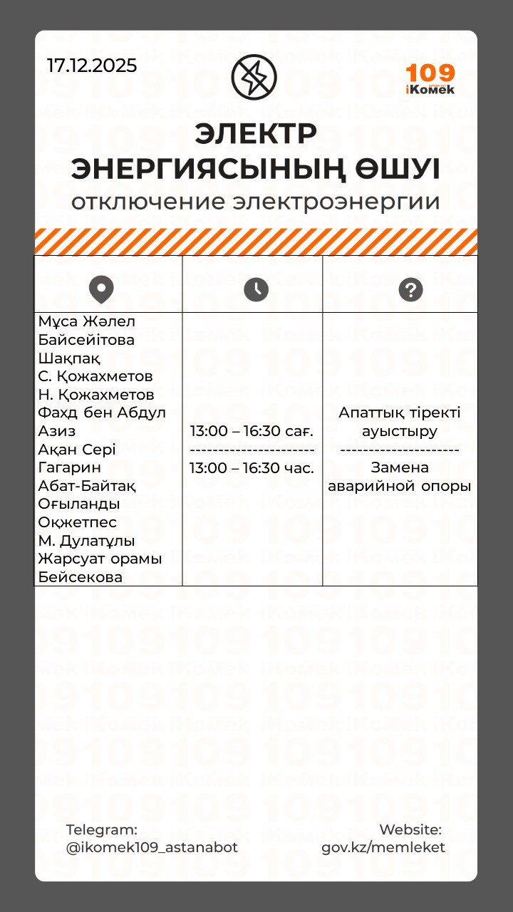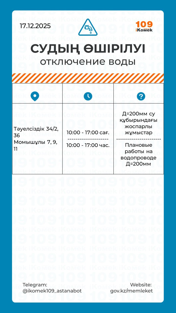 В столице 17 декабря запланированы временные отключения воды и света, передает inbusiness.kz.