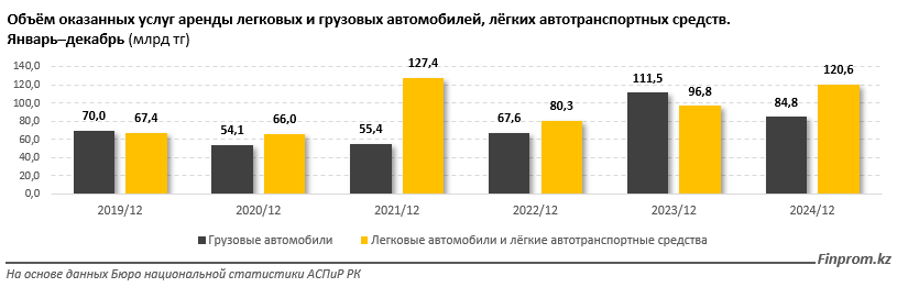 За 2024 год рынок аренды, проката и лизинга в РК показал спад в стоимостном выражении на 8,2%. По данным Бюро национальной статистики АСПиР РК, объём услуг в этой сфере составил 701,8 млрд тг, против 764,4 млрд тг в 2023-м.