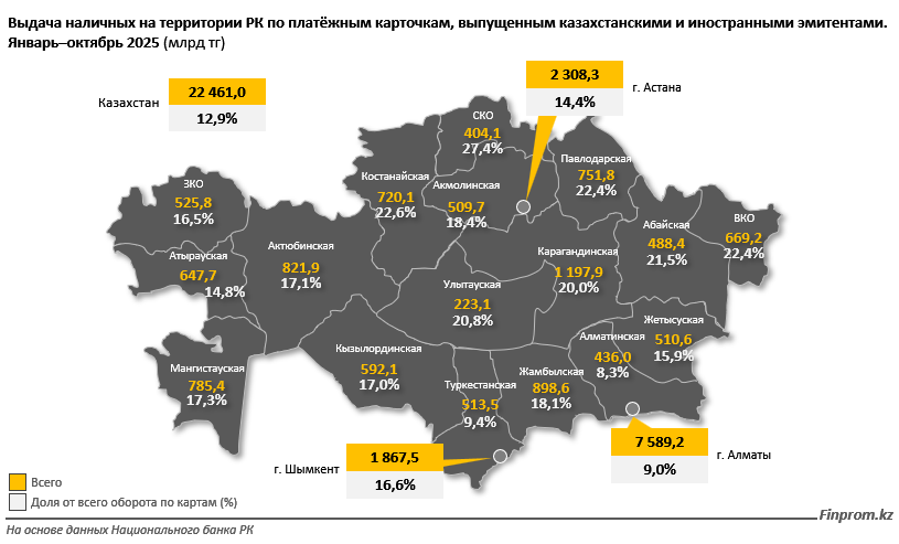По итогам января–октября 2025 года доля операций по снятию наличных в общем обороте по платёжным карточкам в регионах страны колебалась в диапазоне от 8,3% до 27,4%. Минимальные значения зафиксированы в Алматинской области (8,3%), Алматы (9%) и Туркестанской области (9,4%). Несколько выше показатели оказались в Астане и Атырауской области - 14,4% и 14,8% соответственно.