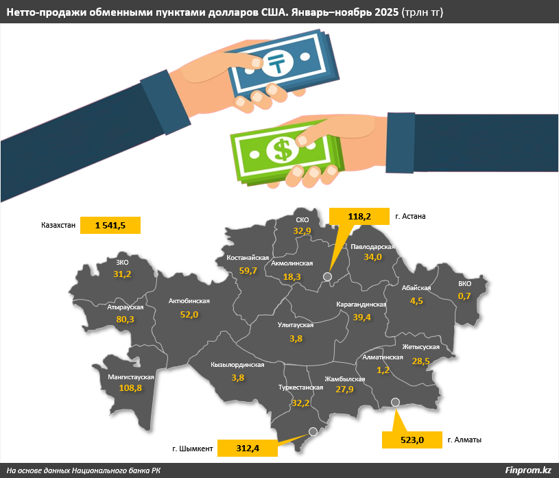 В региональном разрезе по объёму нетто-продаж долларов за январь–ноябрь 2025 года лидировали мегаполисы, передает inbusiness.kz со ссылкой на Finprom.kz.