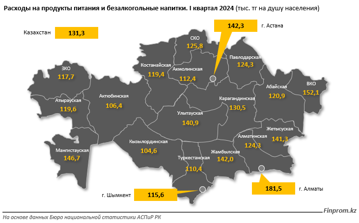"Что касается регионального разреза, наибольшие затраты на еду и напитки понесли жители Алматы: 181,5 тыс. тг на душу населения в первом квартале текущего года, на 7,7% больше, чем годом ранее. По сравнению со среднереспубликанским значением алматинцы потратили на 38,2% больше.