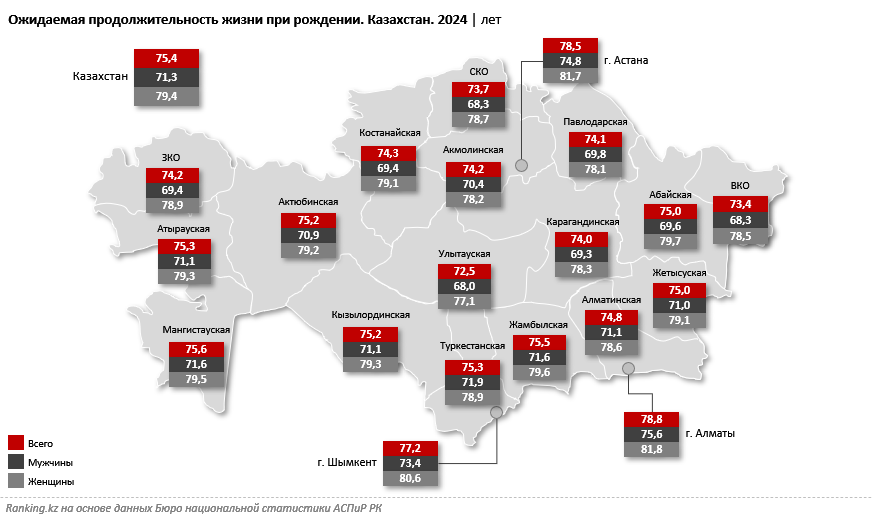 Наименьшая ожидаемая продолжительность жизни была зафиксирована в Улытауской области: 72,5 года (среди мужчин — 68 лет, среди женщин — 77,1 года). Низкие показатели также пришлись на Восточно-Казахстанскую (73,4 года) и Северо-Казахстанскую (73,7 года) области.