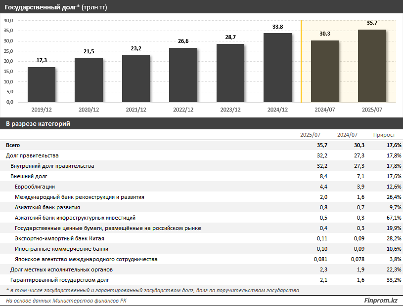 Государственный долг за январь–июль (включая гарантированный долг) достиг рекордной суммы в 35,7 трлн тг, или 68,5 млрд долл., передает inbusiness.kz со ссылкой на Finprom.kz.