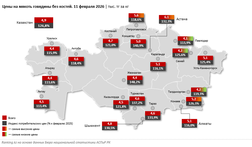 Среди всех крупных казахстанских городов наибольшие средние цены на говядину, судя по данным БНС, в феврале текущего года наблюдались в Астане (6,1 тыс. тг за кг), Петропавловске (5,6 тыс. тг) и Конаеве (5,2 тыс. тг), наименьшие — в Павлодаре (4,1 тыс. тг), Семее и Талдыкоргане (по 4,2 тыс. тг в каждом из городов).