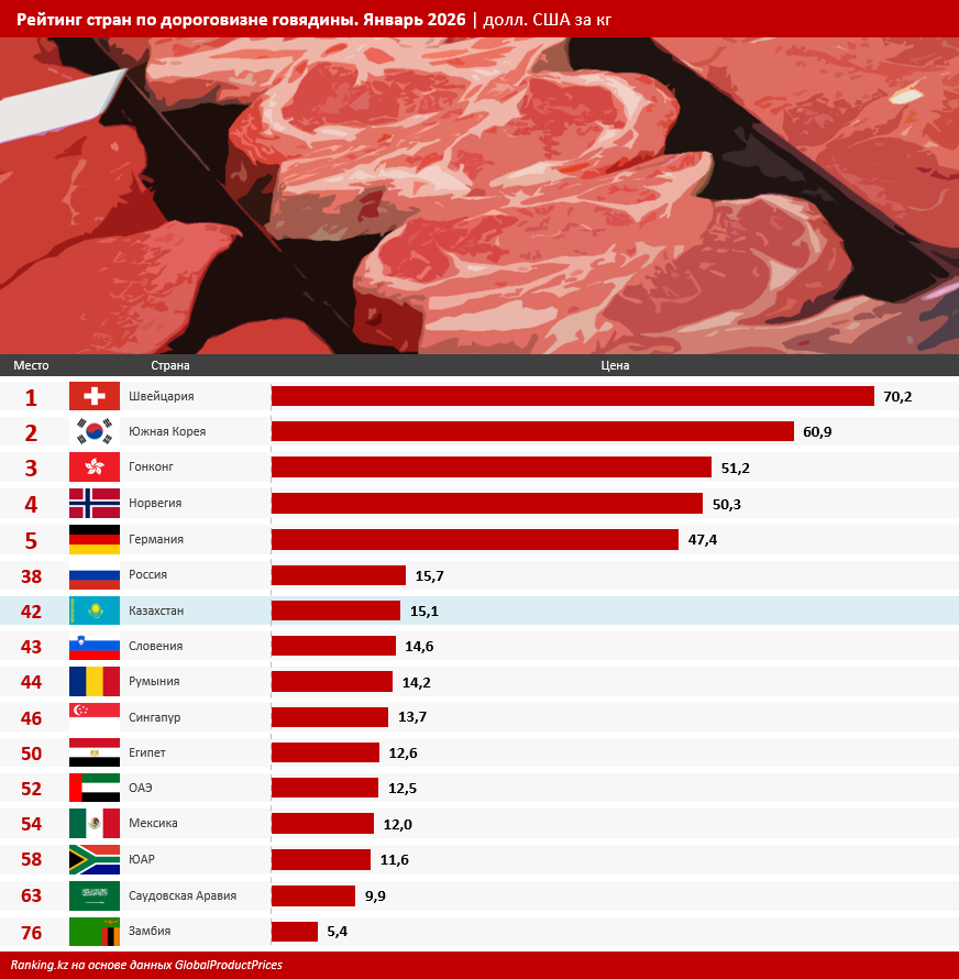 Согласно информации портала Global Product Price, в январе 2026 года наша страна занимала 42-е место в рейтинге по дороговизне говядины среди 76 государств. Цена, указанная глобальной платформой данных для РК, очень близка к реальным ценникам, которые казахстанцы видят не "на бумаге", а на рынках и в магазинах: 15,1 долл., или 7,4 тыс. тг за килограмм говядины, передает inbusiness.kz со ссылкой на Ranking.kz.