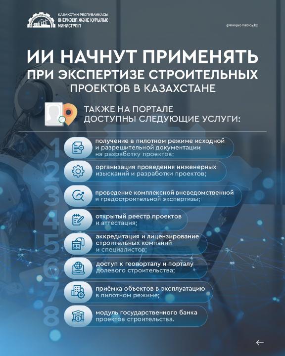 "В этой связи, в первом квартале 2026 года в пилотном режиме планируется внедрение решений на базе ИИ на Едином портале строительства Qportal.kz. Новые технологии будут использоваться при прохождении комплексной вневедомственной экспертизы проектов строительства и позволят автоматизировать проверку комплектности исходной и разрешительной документации, загружаемой заявителями", - пояснили в минпромстрое.