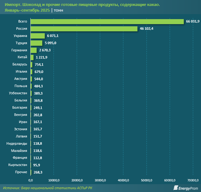 Крупнейшим поставщиком остаётся Россия, обеспечившая почти 70% всего импорта - 46,1 тыс. тонн. Стоимость российского шоколада также заметно выросла: до 4,4 тыс. долларов за тонну, что на треть дороже уровня прошлого года.