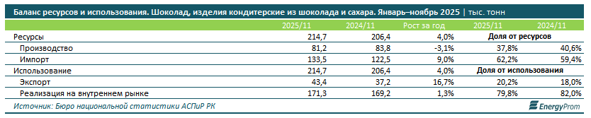 При этом экспорт и реэкспорт шоколада и кондитерских изделий из шоколада и сахара демонстрирует уверенный рост: на 16,7%, до 43,4 тыс. тонн за январь–ноябрь 2025 года. Положительная динамика внешних поставок показывает, что казахстанская продукция остаётся конкурентоспособной на зарубежных рынках.