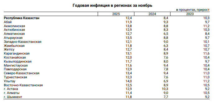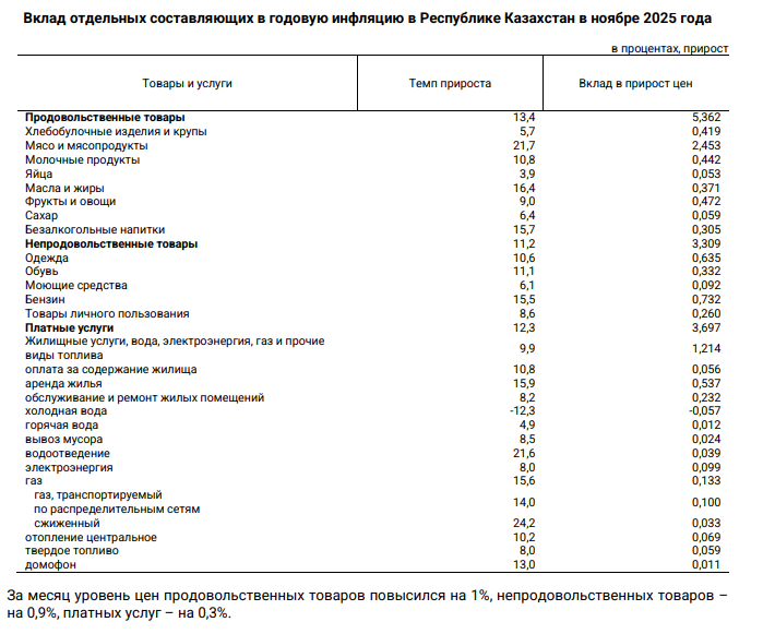 Инфляция в Республике Казахстан в ноябре 2025 года за год составила 12,4%, тогда как в октябре этот показатель был выше — 12,6%. За месяц цены выросли на 0,8% против 0,5% месяцем ранее. Основной вклад в годовой уровень инфляции внесли продукты питания и безалкогольные напитки — 5,2 процентных пункта, здравоохранение — 1,5 процентных пункта, а также жилищные услуги — 1,2 процентных пункта.