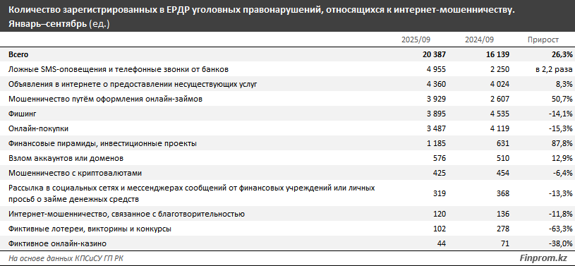 В Казахстане фиксируют новый всплеск онлайн-преступности. По данным комитета по правовой статистике и специальным учетам Генеральной прокуратуры, с начала года зарегистрировано свыше 20 тысяч фактов интернет-мошенничества, что на 26% больше, чем годом ранее. Самыми популярными схемами по-прежнему остаются обман через поддельные SMS и звонки якобы от банковских сотрудников, передает inbusiness.kz со ссылкой на finprom.kz.