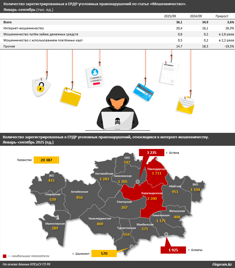Случаи интернет-мошенничества теперь составляют более половины всех зарегистрированных уголовных правонарушений по статье 190 УК РК ("Мошенничество "). Общее же количество уголовных правонарушений по этой статье за три квартала текущего года выросло незначительно: на 3,6%, до 36,1 тыс. случаев.