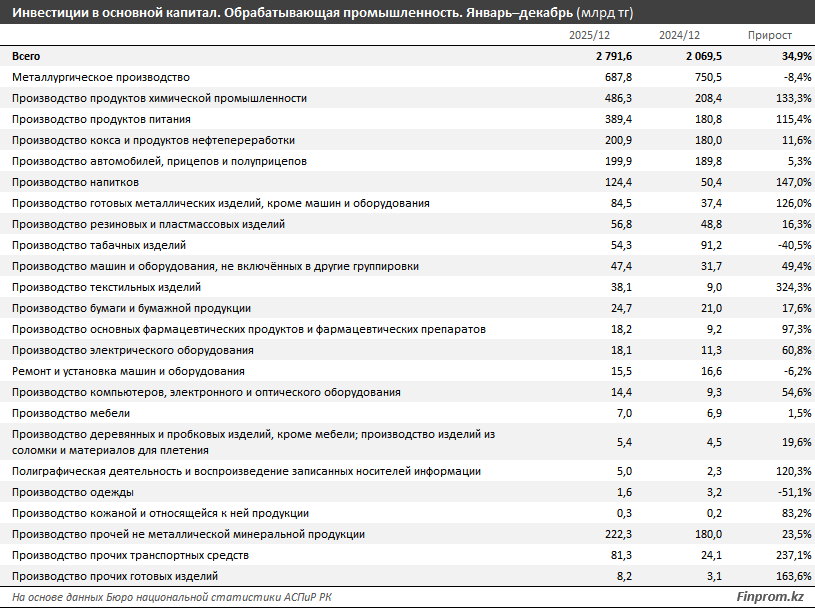 Существенные объёмы инвестиций зафиксированы и в других сегментах. В производство кокса и продуктов нефтепереработки направлено 200,9 млрд тенге, в производство автомобилей, прицепов и полуприцепов — 199,9 млрд тенге. Производство напитков привлекло 124,4 млрд тенге.