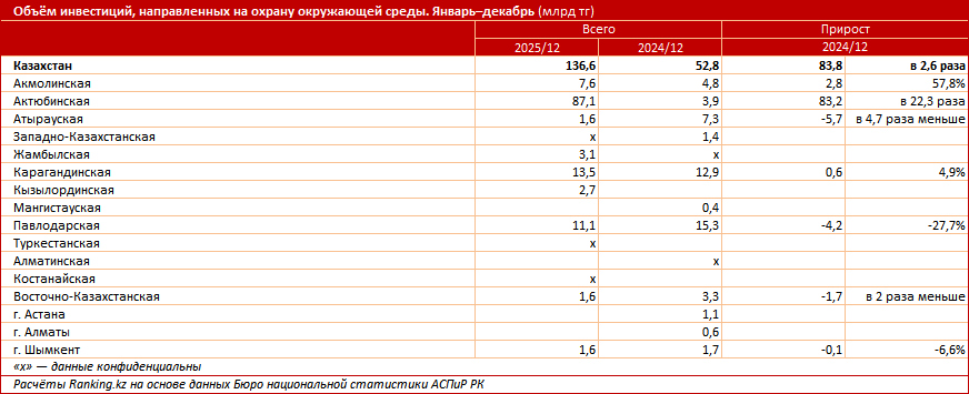 Основной вклад в столь существенный прирост внесла Актюбинская область. Здесь объём вложений увеличился с 3,9 млрд до 87,1 млрд тенге. Такой скачок может свидетельствовать о реализации масштабных экологических проектов в регионе.