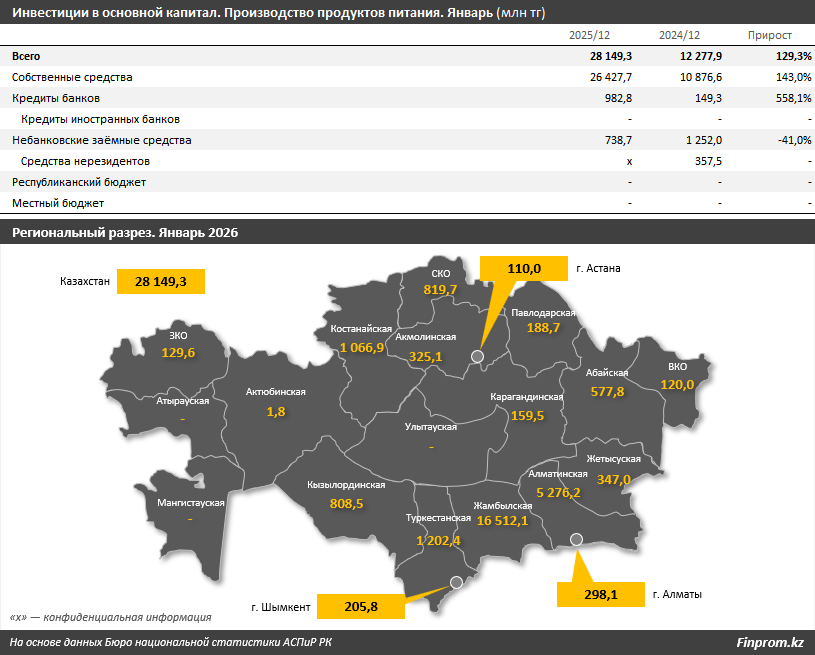 В январе 2026 года объём капитальных вложений в производство продуктов питания Казахстана составил 28,1 млрд тенге, что на 2,3 раза больше по сравнению с аналогичным периодом прошлого года. Важной особенностью является то, что более 90% инвестиций (26,4 млрд тенге) были обеспечены собственными средствами предприятий, в то время как банковские кредиты и небанковские источники сыграли менее значительную роль (982,8 млн и 738,7 млн тенге соответственно).