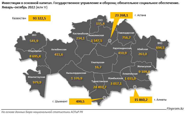 За январь–октябрь текущего года инвестиции в основной капитал в сфере государственного управления и обороны, а также обязательного социального обеспечения составили 93,3 млрд тг — сразу в 2,4 раза больше в стоимостном выражении, чем годом ранее. Реальный рост вложений — в 2,2 раза.