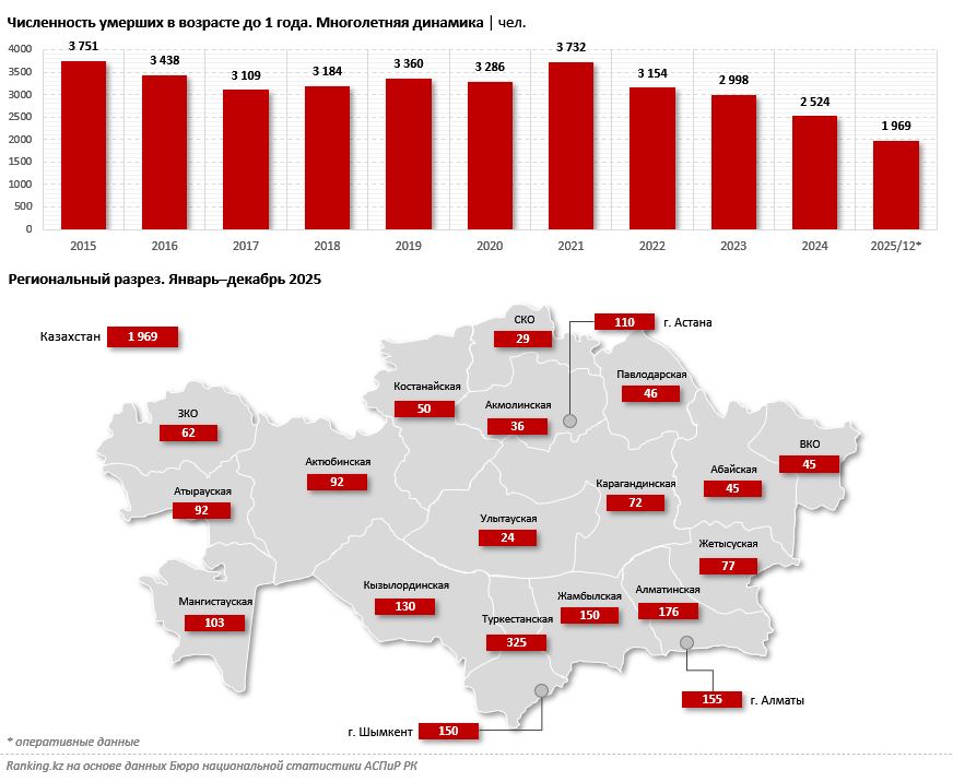 Больше всего умерших в возрасте до 1 года пришлось на густонаселённый юг: в Туркестанской области умерли 325 младенцев, в Алматинской — 176, в Алматы — 155, в Шымкенте и Жамбылской области — по 150. Минимальный показатель был зафиксирован в Улытауской области: 24 человека.