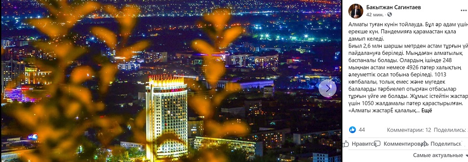 "Алматы празднует День рождения. Это особенный день для каждого. Несмотря на пандемию, город развивается", - написал аким Алматы, передает inbusiness.kz.