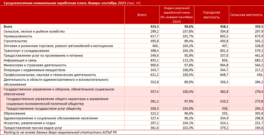Согласно данным Бюро национальной статистики (БНС) АСПиР РК, среднемесячная номинальная заработная плата в сфере государственного управления и обороны, обязательного социального обеспечения в январе–сентябре 2025 года составляла 357,4 тыс. тг — на 17,5% меньше средней номинальной зарплаты по экономике.