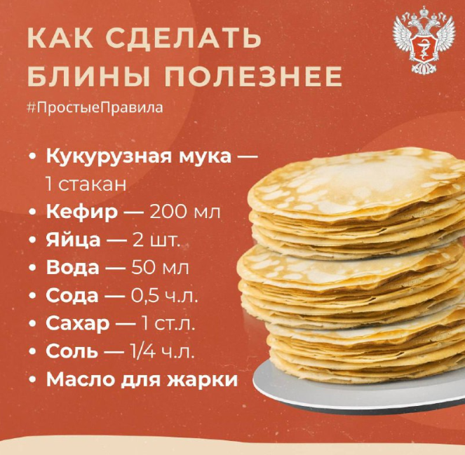 Специалист подчёркивает, что привычные блины можно сделать значительно полезнее, если осознанно подойти к рецептуре. В первую очередь, рекомендуется заменить пшеничную муку на цельнозерновую — кукурузную, овсяную или гречневую. Такая мука надолго насыщает, улучшает пищеварение, благотворно влияет на микроорганизмы кишечника и содержит множество витаминов и минералов, включая витамины группы В, железо, кальций и другие полезные вещества.