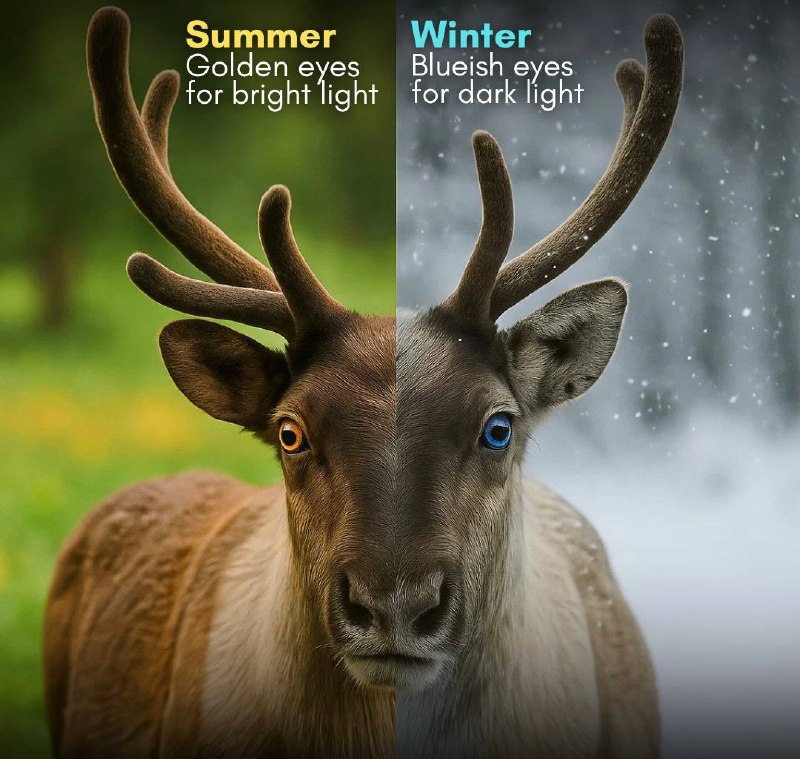 В сезон полярных перемен встает любопытная тема о том, как северные олени приспосабливаются к жизни в условиях, где свет и тьма делят год почти поровну. Одним из самых поразительных механизмов выживания у этих животных является способность менять цвет глаз в зависимости от времени года. Это выглядит как причуда природы, но на самом деле является тонкой адаптацией, позволяющей оленю уверенно чувствовать себя и под ярким северным солнцем, и в долгие недели зимней темноты, передает inbusiness.kz со ссылкой на телеграм-канал об окружающем мире Geo.