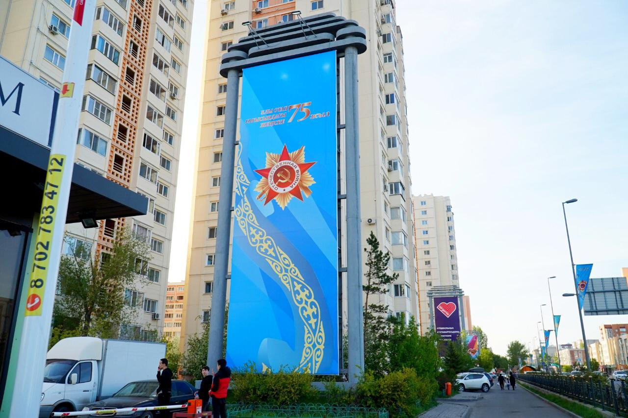 Улицы города не так многолюдны, как обычно, но, тем не менее, чувствуется, что столица в ожидании большого торжества, сообщает сайт акимата Нур-Султана. Праздничная символика повсюду: установлены флаговые конструкции и развешаны многочисленные плакаты с символикой Дня Победы, а на остановочных павильонах – поздравления с Днем защитника Отечества и 9 Мая.