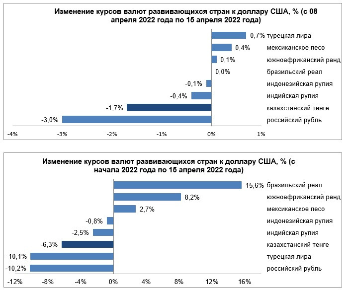 По итогам торгов 15 апреля рыночный курс тенге сложился на уровне 454,27 тенге за доллар США, ослабев за неделю на 1,7% (с 446,89), передает inbusiness.kz со ссылкой на сайт Нацбанка РК. Динамика валют развивающихся рынков была разнонаправленной. На внешнем валютном рынке произошел ряд значимых событий. На фоне выхода данных о росте инфляции в США ниже ожиданий аналитиков, американская валюта начала демонстрировать снижение. Однако выступление президента Федерального резервного банка Нью-Йорка Джона Уильямcа об укреплении ожиданий по поводу повышения в следующем месяце процентной ставки на 150 б.п. в целях борьбы с рекордным показателем инфляции, развернуло тенденцию. С подобным заявлением также выступила президент ЕЦБ Кристин Лагард, просигнализировав об окончании количественного смягчения и возможности повышения процентных ставок.