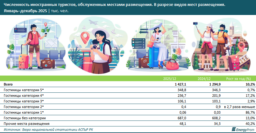 "Ошибочно было бы думать, что иностранные туристы, в основном, останавливаются в дорогих пятизвёздочных гостиницах. На самом деле почти половина (48,1%) гостей из-за рубежа, обслуженных казахстанскими местами размещения, живут в простых гостиницах без категории. В 2025 году таковых было больше на 13%, чем годом ранее: 687 тыс. человек. Это указывает на востребованность бюджетного сегмента среди иностранных гостей", - пришли к выводу авторы исследования, посвященного развитию туризма в Казахстане.