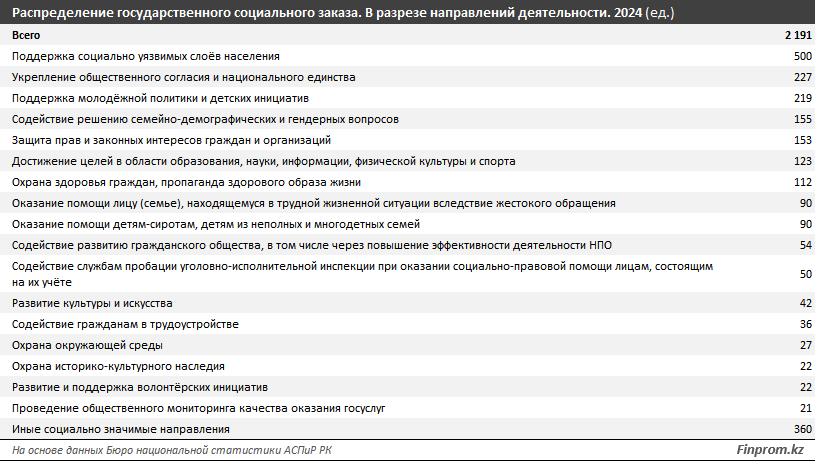 НПО, работающие в рамках государственного социального заказа, реализуют проекты по темам, которые государство считает актуальными для решения социально значимых проблем. Наиболее востребованное направление — поддержка социально уязвимых слоёв населения. В 2024 году в Казахстане было выполнено 500 таких проектов, что составляет четверть всех реализованных грантов. Эта тематика сохраняет лидерство на протяжении нескольких лет.