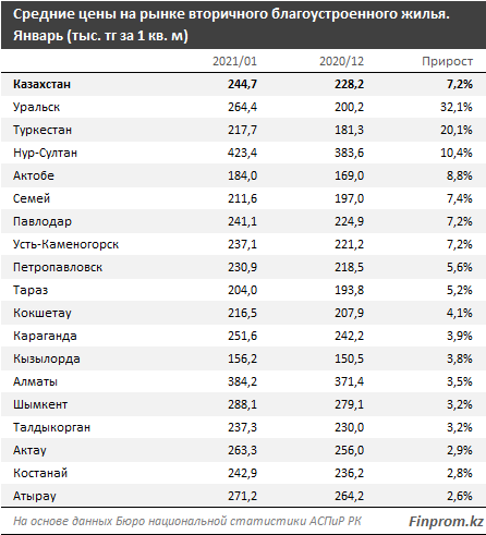 На рынке вторичного благоустроенного жилья средние цены в январе выросли во всех городах РК. Самый заметный рост наблюдался в Уральске (+32,1%), Туркестане (+20,1%) и Нур-Султане (+10,4%). В Алматы цены выросли на 3,5%, в Шымкенте — на 3,2%.
