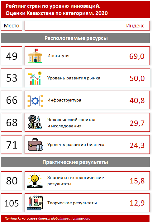 Самый низкий показатель у РК — по категории "Творческие результаты": здесь индекс составил всего 12,9 (105-я строчка рейтинга). Это категория учитывает нематериальные активы, креативные товары, а также услуги и интернет-творчество.
