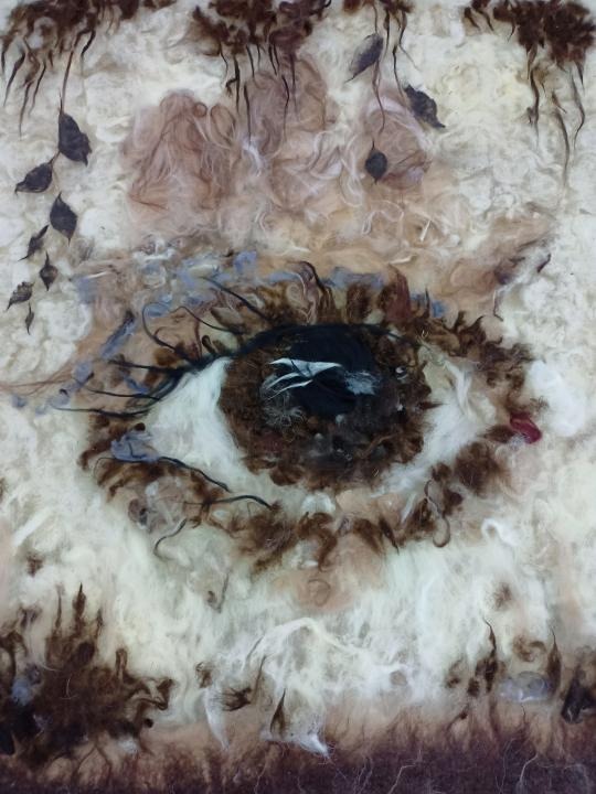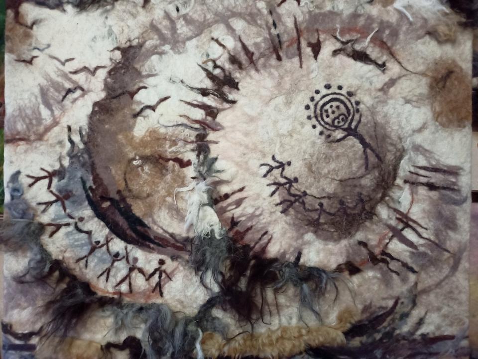 На выставке Евгения Шульц представила несколько работ. Это тематический триптих из шерсти ручной обработки "Мудрость веков", украшенный резьбой по кости, этническое панно "Ловец снов" из меха, войлочные картины "Жер Су", "Дорога к дому" и "Песнь о вечной любви".
