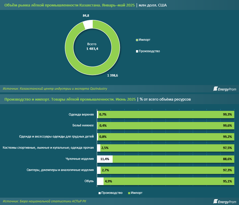 По данным Казахстанского центра индустрии и экспорта QazIndustry, за первые пять месяцев текущего года общий объём рынка лёгкой промышленности в РК приблизился к 1,5 млрд долл., или 758,8 млрд тг. Из них 94,3% пришлось на импортную продукцию, и только 5,7% — на собственное производство.