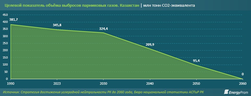 Казахстан принял Стратегию достижения углеродной нейтральности до 2060 года в феврале 2023 года. Документ предусматривает поэтапное и устойчивое сокращение выбросов парниковых газов. Согласно целевым показателям, объём национальных нетто-эмиссий должен снизиться с 345,8 млн тонн CO₂-эквивалента в 2023 году до нулевого уровня к 2060 году. Это предполагает отказ от углеродоёмких источников энергии и глубокую перестройку экономики с акцентом на развитие "зелёных" технологий, учитывая, что сегодня основной вклад в выбросы вносит энергетический сектор.