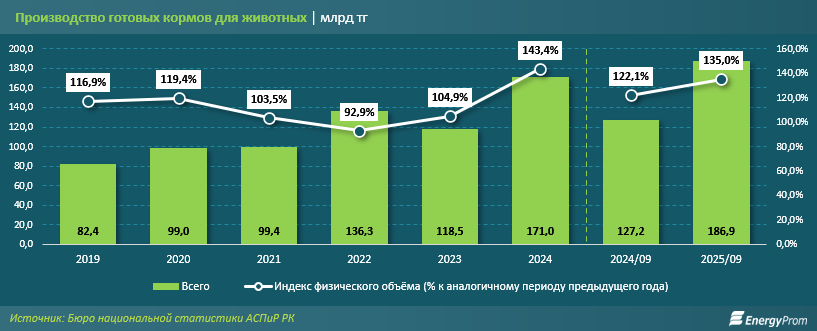 Рост числа таких предприятий уже отражается на статистике: по данным бюро национальной статистики, за девять месяцев 2025 года объём производства кормов для животных вырос на 35%, достигнув 186,9 млрд тенге.