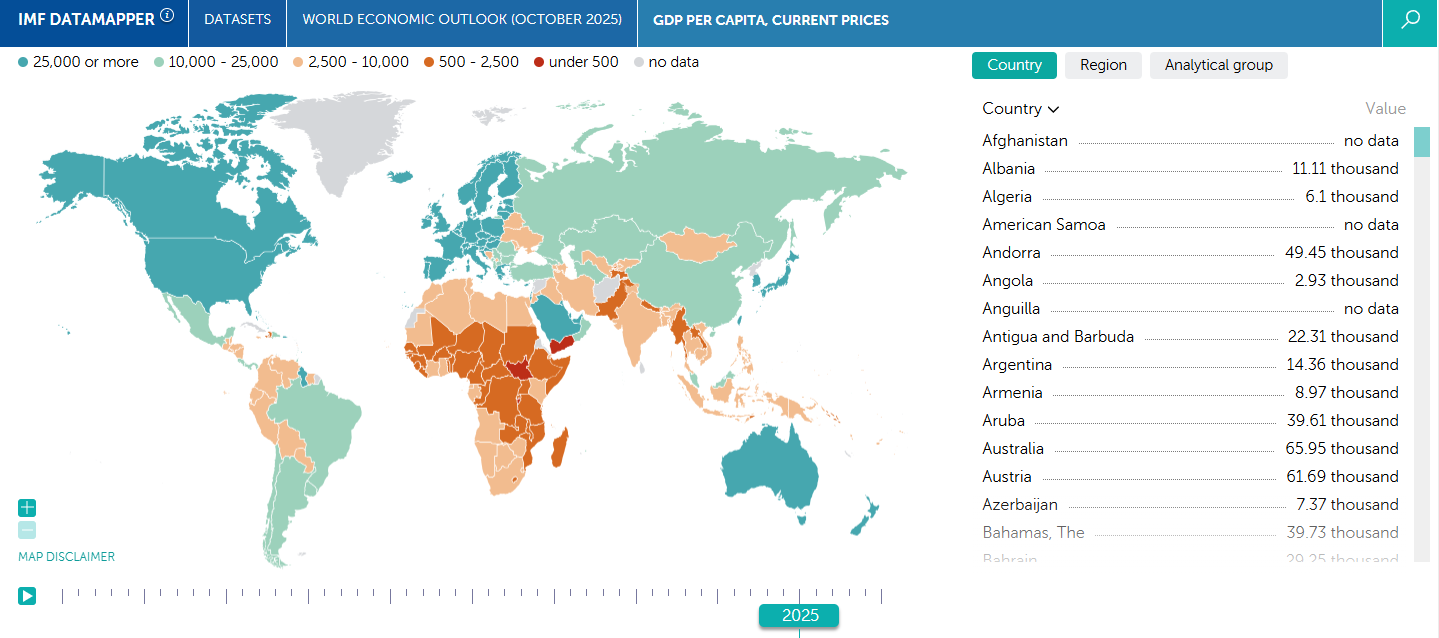МВФ рассчитывает ВВП на душу населения по текущим ценам, что позволяет оценить общий уровень благосостояния и покупательной способности.