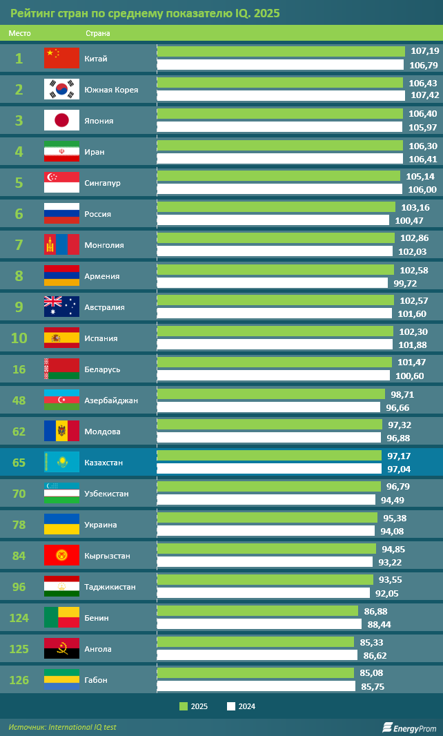 В рейтинге стран по среднему уровню IQ Казахстан в 2025 году попал на 65-е место из 126. Средний показатель IQ казахстанцев составил 97,2, причём по сравнению с прошлогодним показателем (97) он немного вырос, сообщает inbusiness.kz со ссылкой на Еnergyprom.kz.