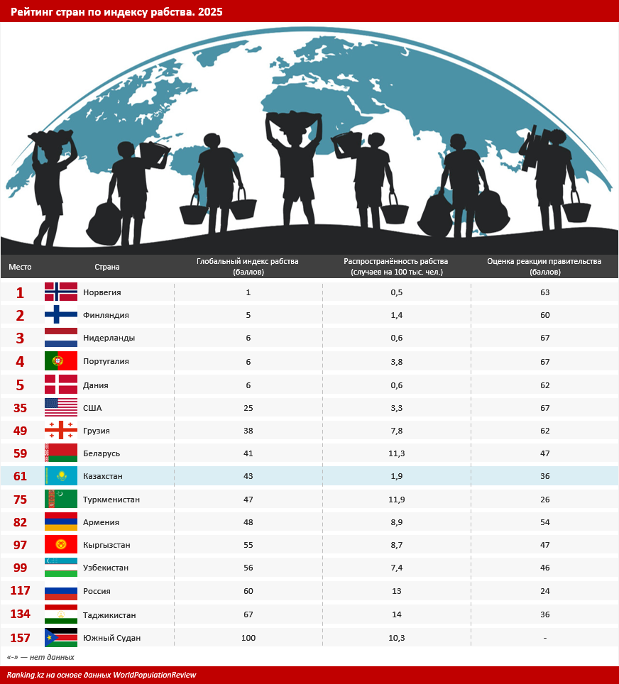 Согласно данным международной медиаплатформы World Population Review, в прошлом году Казахстан занимал 61-е место среди 157 стран по индексу рабства с показателем в 43 балла — лучше, чем в большинстве государств СНГ и Центральной Азии, сообщает inbusiness.kz со ссылкой на Ranking.kz.