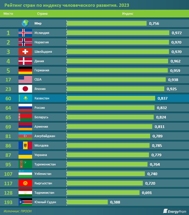 В 2023 году РК заняла в рейтинге 60-е место из 193 с индексом 0,837. В сравнении с другими государствами СНГ и ЦА у Казахстана самый высокий показатель. Чуть меньше ИЧР у России (0,832) и Беларуси (0,811). Страны ЦА расположились в рейтинге ниже: Туркменистан — на 95-м месте с индексом 0,764, Узбекистан — на 107-м, Кыргызстан — на 117-м, Таджикистан — на 128-м.