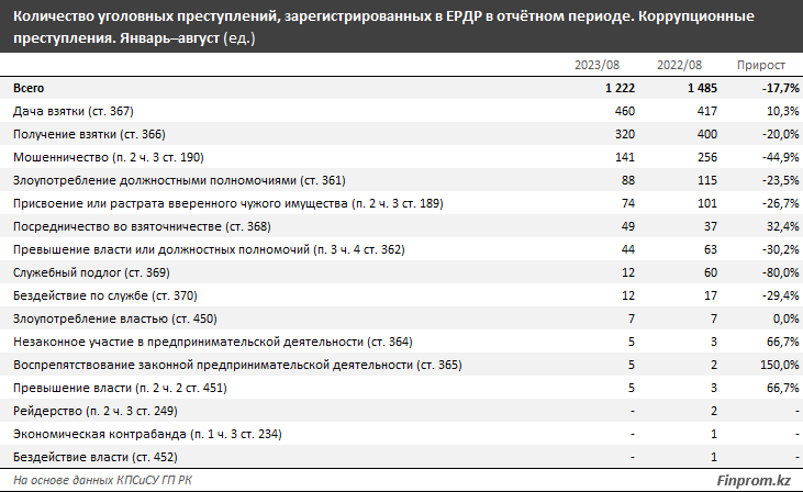 Тем временем в РК по итогам января–августа текущего года в Едином реестре досудебных расследований (ЕРДР) было зарегистрировано 1,2 тыс. коррупционных уголовных преступлений — на 17,7% меньше, чем годом ранее. В том числе 855 случаев относились к тяжким преступлениям, 283 случая — к преступлениям средней тяжести, 43 случая — к особо тяжким преступлениям, 41 случай — к преступлениям небольшой тяжести.