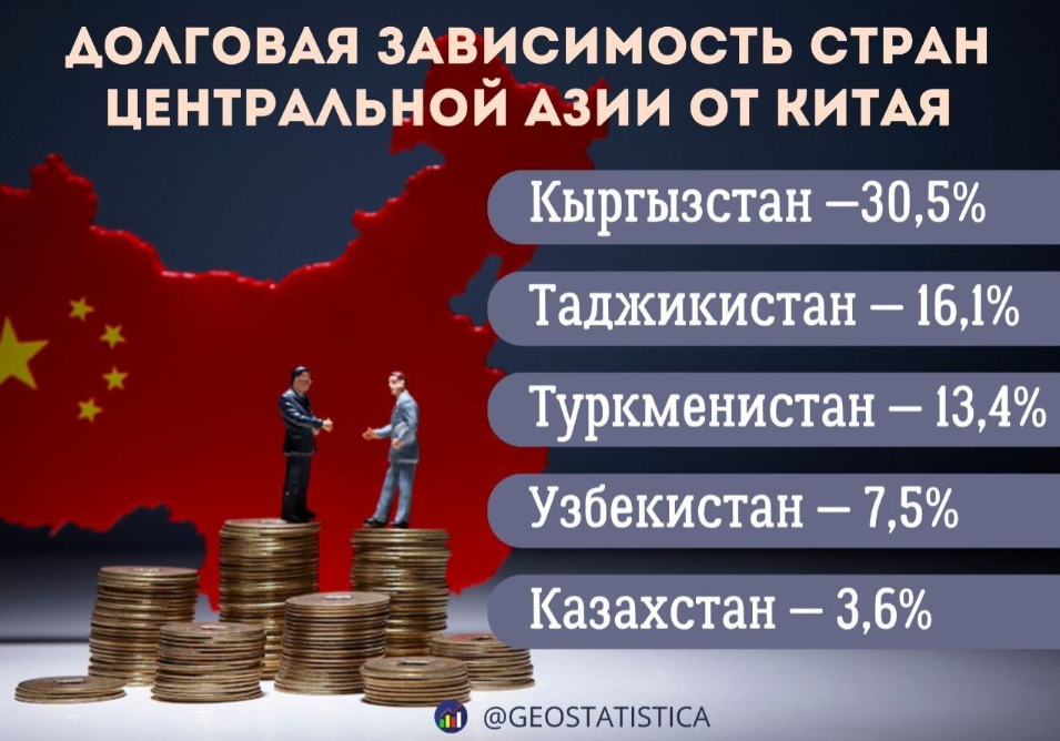 Согласно представленным данным, Кыргызстан лидирует по долговой зависимости от Китая — 30,5 процента. Далее следуют Таджикистан с показателем 16,1 процента, Туркменистан — 13,4 процента и Узбекистан — 7,5 процента. Казахстан занимает последнюю позицию — всего 3,6 процента.