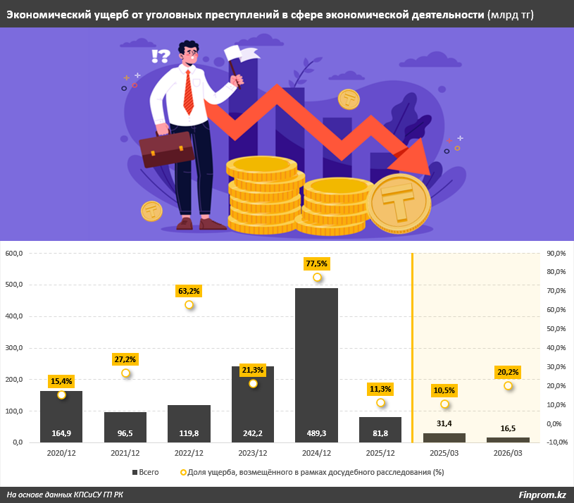 "Такое непостоянство связано с особенностями экономических преступлений и их раскрываемости. Волатильность зависела в первую очередь от тяжести и сумм ущерба по каким-либо отдельным уголовным преступлениям. Например, максимальная сумма в 489,3 млрд тг в 2024 году объясняется раскрытием группы уголовных преступлений по отмыванию денег и имущества, полученных преступным путём. Действиями преступников, занимавшихся легализацией преступно нажитых доходов, государству тогда был причинён урон на сумму 346,1 млрд тг", - говорится в исследовании.
