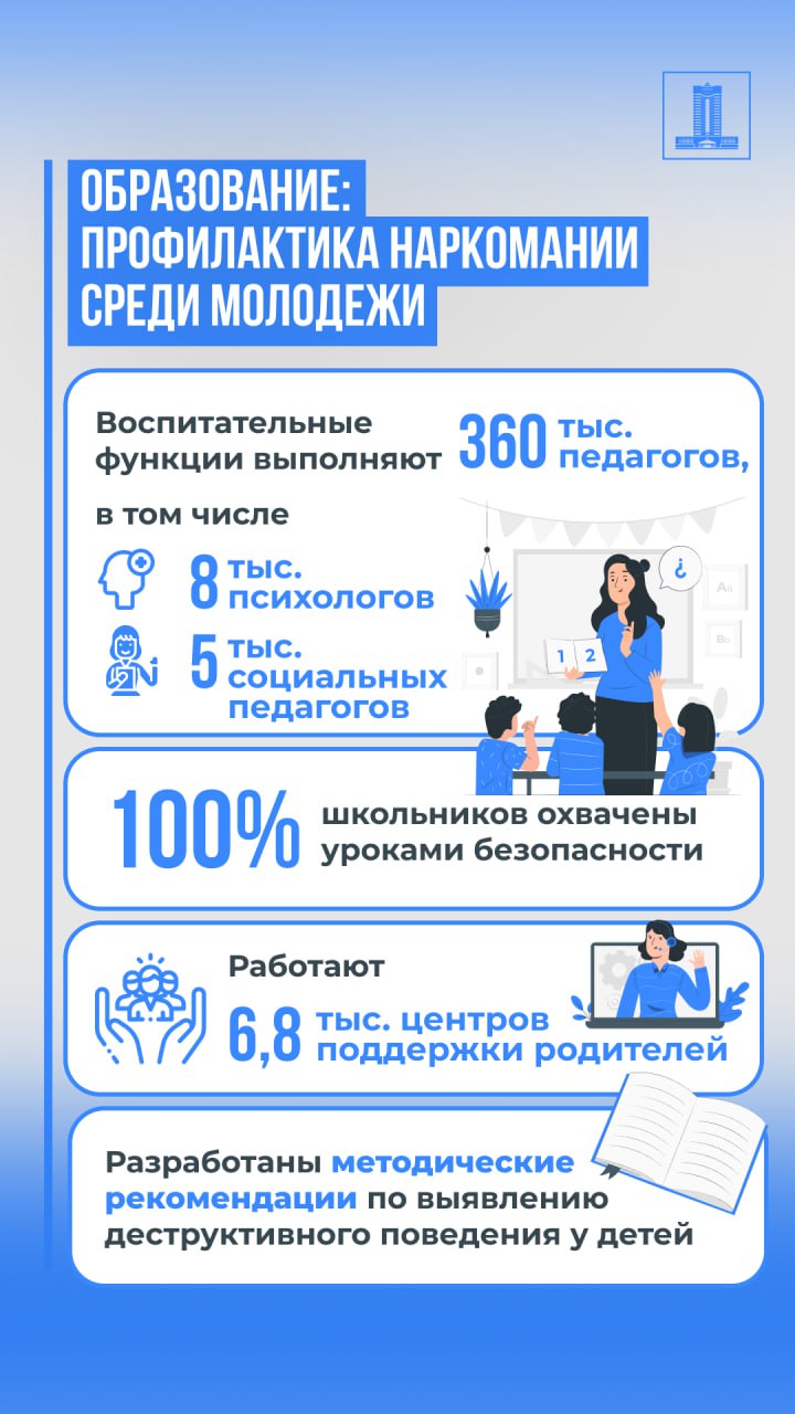 Отдельное внимание уделено вопросам кибербезопасности. Министерствам культуры и информации, искусственного интеллекта и Комитету национальной безопасности поручено активизировать автоматическую блокировку таргетированной рекламы и наркосайтов. Министерству юстиции предстоит оснастить органы судебной экспертизы современным оборудованием для выявления новых видов синтетических наркотиков и ускорить проведение экспертиз.