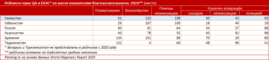 Наилучший показатель по пожертвованиям среди стран ЦА и ЕАЭС — у Узбекистана (29-е место), а наихудший — у Армении (134-е место). Казахстан, в свою очередь, занял 51-е место, уступив не только Узбекистану, но и Кыргызстану (40-е место). В рейтинге по волонтёрству худшие показатели достались Армении и Казахстану (131-е и 122-е места соответственно), а лучший — Таджикистану (четвёртое место). При этом в рейтинге по помощи незнакомцам наихудший показатель — у Казахстана (138-е место), а наилучший — у Кыргызстана (55-е место).