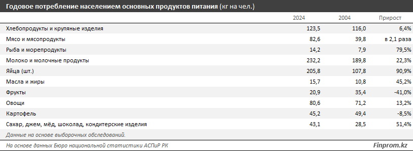 Они стали есть в 2 раза больше мяса (82,6 кг на человека в год), на 79,5% больше рыбы и морепродуктов (14,2 кг), на 51,4% больше сладостей (сразу 43,1 кг), передает inbusiness.kz со ссылкой на Finprom.kz.