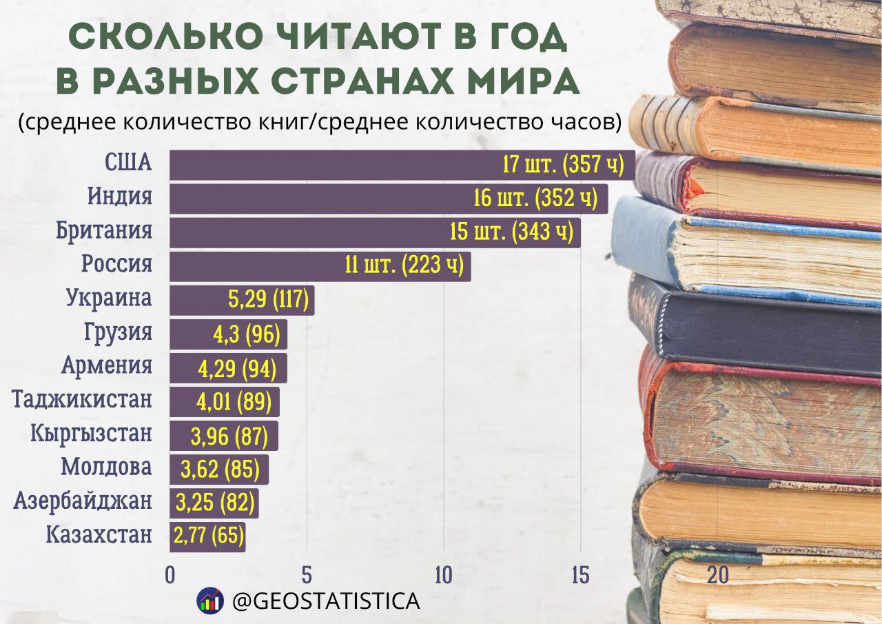 Среди СНГ результаты сильно различаются. Так, жители Украины, в среднем, читают 5,29 книги в год, грузины — 4,3, армяне — 4,29, таджикистанцы — 4,01, кыргызы — 3,96, а азербайджанцы — 3,25 книги.