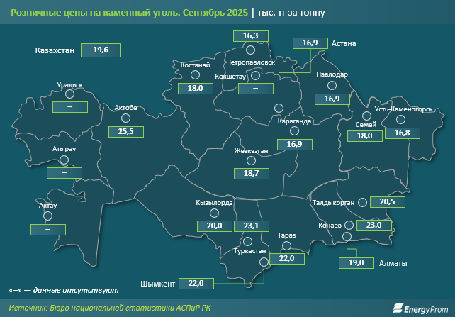 По данным Еnergyprom.kz, розничная цена одной тонны каменного угля в сентябре 2025 года в среднем по Казахстану составила 19,6 тыс. тг.