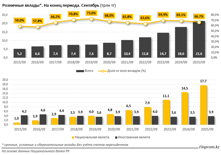 Объём розничных вкладов* на сентябрь 2025 года достиг 21,6 трлн тг — на 19,9% больше, чем годом ранее. Доля розничных депозитов с 2020-го варьируется в пределах 63,6%–69,9% от всего объёма вкладов, на сентябрь текущего года она составила 66,7%, передает inbusiness.kz со ссылкой на Finprom.kz.